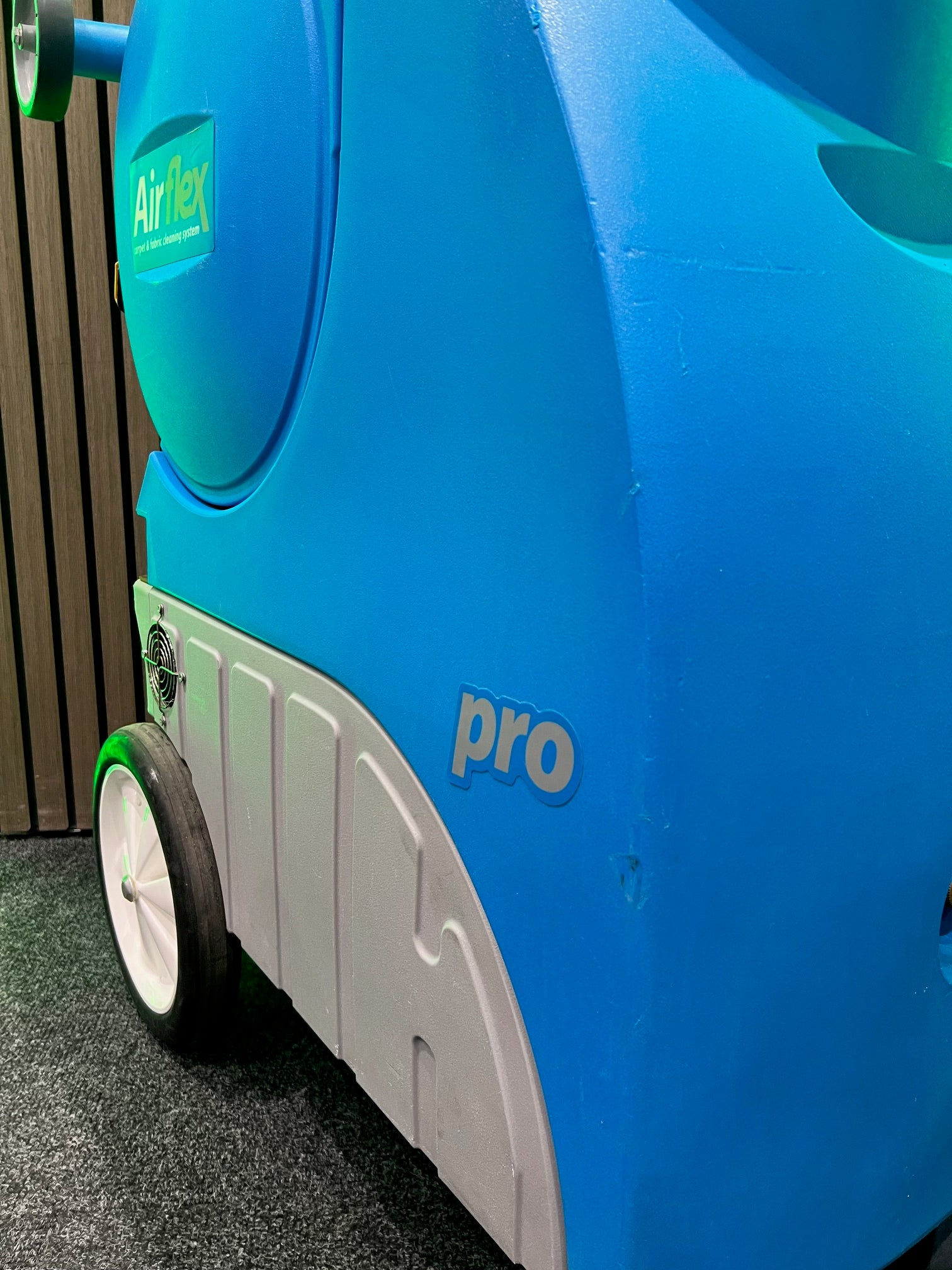 83cm long x 43cm wide x 103cm high. Airflex is big enough to really impress your customers, but is easy to manoeuvre and lightweight compared to other machines in the same class. Airflex has huge 12″ ‘stair climbing’ rear wheels with built in shock absorbency and there’s a brake on the front caster (we think all extractors should have a brake but few do!).