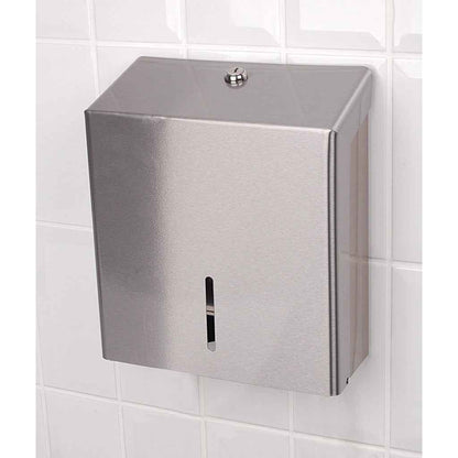 A sturdy, high-quality dispenser for use with C-folded paper hand towels. Made from stainless steel for easy hygienic cleaning with a lockable hinged cover with viewing window to check content levels. Also available in medium size.
